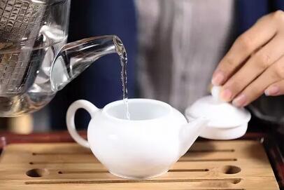 过1分钟左右,将壶盖打开放在“盖置”上,提壶注水入杯以“温杯”。注茶后加适度热水“醒茶”,到了茶在壶内已快“醒”到适当时,再将温杯水倒掉。提壶注水倾茶入杯或是持杯敬茶前,养成在茶巾上沾一下的习惯,使壶底、杯底的水滴,被茶巾吸干。